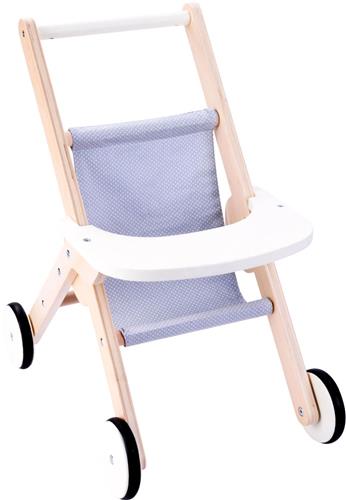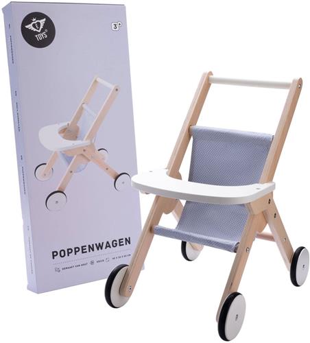| Verpakkingsinhoud | De wandelwagen is gemaakt van hout en heeft een grijs/ blauw zitje voor de pop. |
