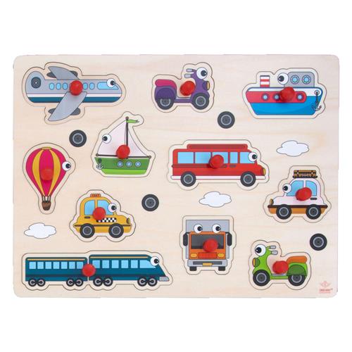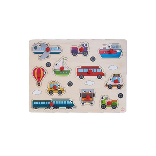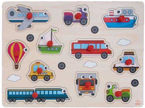 Met de Engelhart Vormenpuzzel Voertuig Junior van 30 cm groot en 12 houten stukjes, hebben kinderen uren speelplezier. Deze houten puzzel met knopjes aan de bovenzijde heeft stukjes in de vorm van verschillende voertuigen zoals een vliegtuig, boot, taxi, auto en trein. Het formaat van de puzzel is ongeveer 30 x 22 cm, gemaakt van duurzaam hout. Een geweldige uitdaging die de fijne motoriek en oog-hand coördinatie stimuleert.