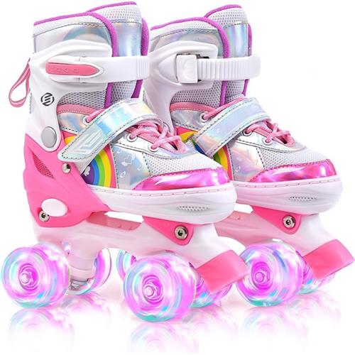 Laat uw kind oogverblindend skaten met de 8 lichtgevende wielen van deze rolschaatsen. Deze wielen stralen automatisch zodra ze in beweging komen en geven een prachtig regenboogeffect in de zon, zonder dat er batterijen nodig zijn. Niet alleen leuker skaten, maar ook zorgt het ervoor dat uw kind goed zichtbaar is.