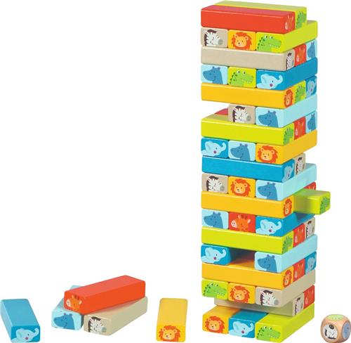 Evenwichtsspel: BALANCERENDE TOREN Dieren 7,5x7,5x27cm, 55-delig, met gekleurde dobbelsteen, hout, 4+