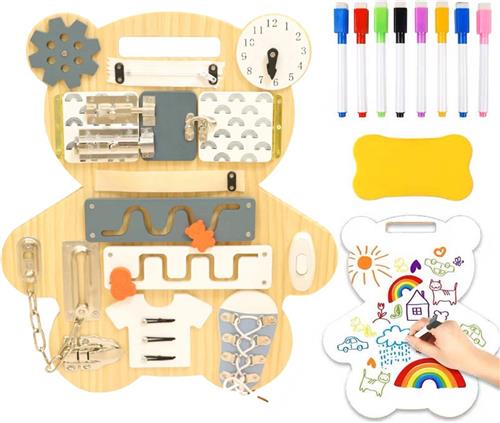 Met het vernieuwde houten busy board verveelt uw kind zich geen minuut meer! Door middel van tal van leuke creatieve spelletjes is eindeloos speelplezier een garantie. Het houten busy board in de vorm van een beer bevat op de voorkant een 13-tal oefeningen waar uw kind zijn of haar cognitieve basisvaardigheden op een leuke manier kan ontwikkelen. Dat is nog niet alles! Ook biedt dit houten speelbord van EverGoods de mogelijkheid om op de achterkant creatieve tekeningen te maken! Al met al een leuke en leerzame combinatie.