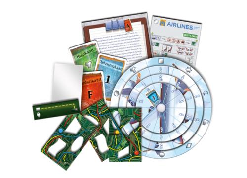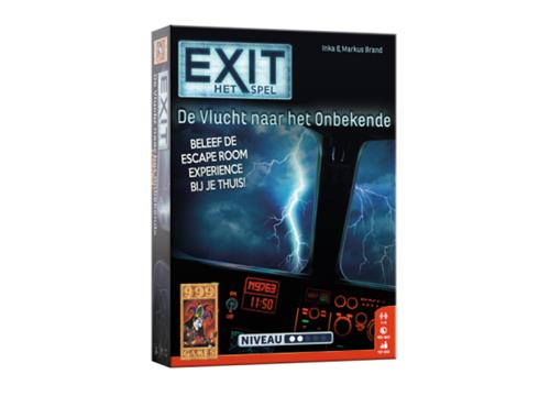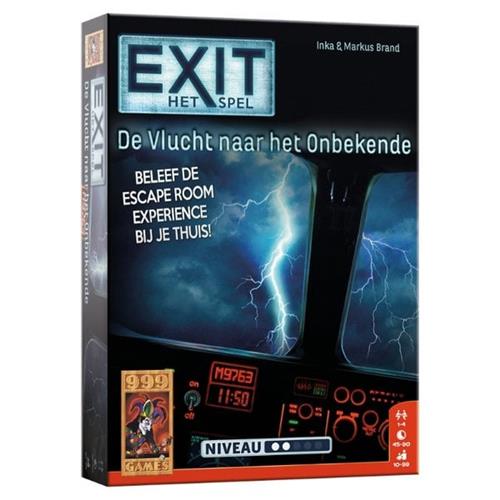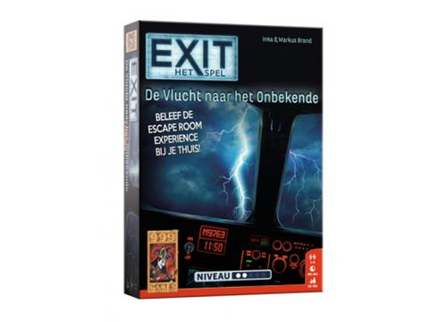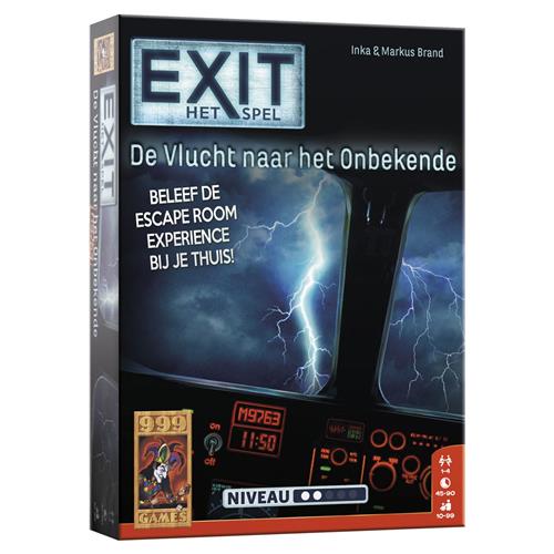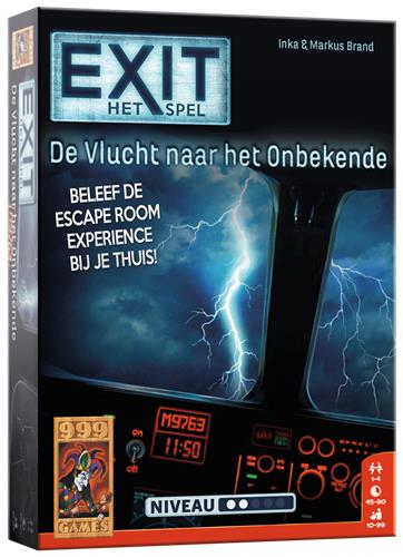 Je maakt deel uit van de bemanning van een passagiersvliegtuig. Plots zit je middenin een storm. Water dringt het vliegtuig binnen en de systemen beginnen te falen. Weet jij het vliegtuig te repareren en veilig te landen? Er blijft weinig tijd over… Vanaf 10 jaar 1 - 4 spelers. Als deel van de bemanning van een passagiersvliegtuig slaat de schrik je om het hart als jullie worden overvallen door noodweer. De wind schud het vliegtuig heen en weer, water stroomt naar binnen en alle systemen beginnen te falen. Het wordt een race tegen de klok om het vliegtuig op tijd weer aan de praat te krijgen. Probeer binnen anderhalf uur alle puzzels op te lossen en alle codes te breken. Alleen dan lukt het jullie om de storm te overleven en het vliegtuig weer veilig te laten landen. Logisch nadenken en doorzettingsvermogen zijn vereist om dit spel tot een goed einde te brengen. En komen jullie er echt niet uit, dan bevat het spel tipkaarten om jullie op het goede spoor te brengen. EXIT: De vlucht naar het onbekende is maar één keer speelbaar omdat het speelmateriaal moet worden beschreven, gevouwen of afgescheurd. Maar net als in een echte escape room garanderen we een unieke puzzel- en speelervaring! De vlucht naar het onbekende heeft een niet te al te hoge moeilijkheidsgraad en is dus uitermate geschikt voor beginners en ontspannen puzzelaars.