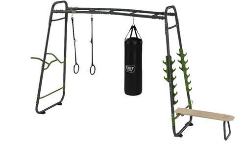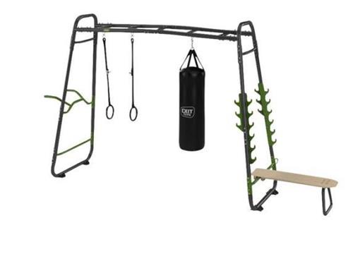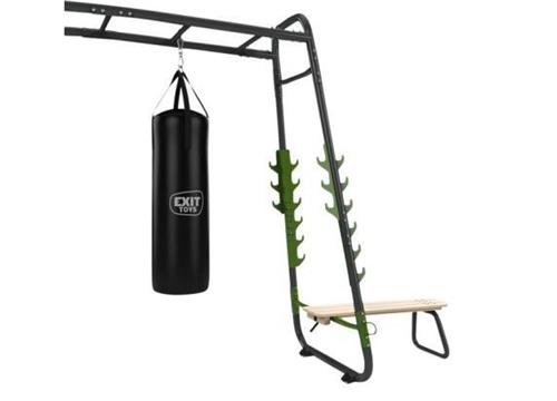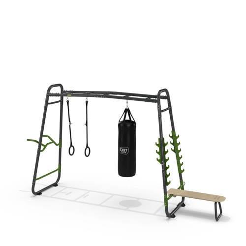 Dit EXIT GetSet Monkeybar MB230 - Outdoor Fitness - Speeltoestel biedt een multifunctionele fitnesservaring voor buiten. Met een sterk frame van gegalvaniseerd en gepoedercoat staal is dit fitnessrek van ruim drie meter ontworpen voor sportieve 14-plussers en volwassenen. De monkeybar wordt geleverd met diverse accessoires, zoals een push-up stang, dip station, fitnessbank en meer, waardoor je eindeloos kunt variëren in je workouts en verschillende spiergroepen kunt trainen. Tegelijkertijd stimuleer je met dit fitnesstoestel jouw gezin om actief te bewegen en samen te sporten in de eigen tuin.