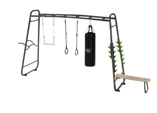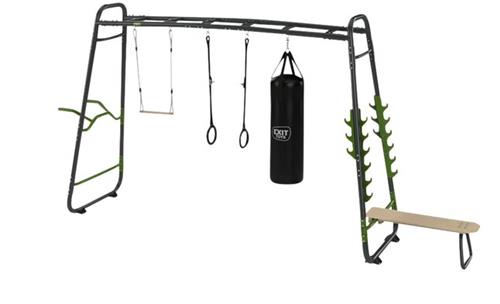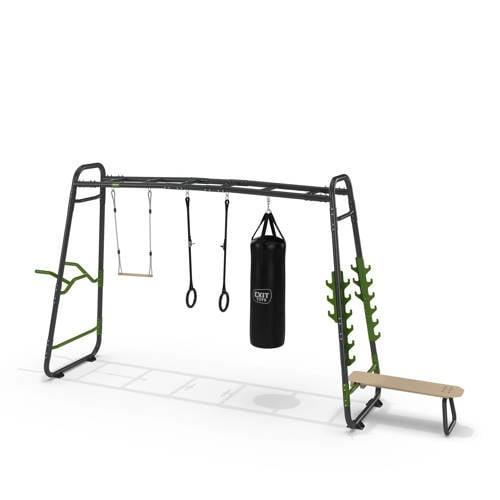 De EXIT GetSet MB330 is een veelzijdig fitnessrek van bijna vier meter lang dat speciaal ontworpen is voor gebruik buitenshuis. Dit indrukwekkende monkeybar frame wordt geleverd met een breed scala aan accessoires, waaronder een push-up stang, dip station, trapeze, bokszak en nog veel meer. Met deze complete set kunnen sportieve tieners vanaf 14 jaar en volwassenen genieten van eindeloos speel- en sportplezier in hun eigen achtertuin.