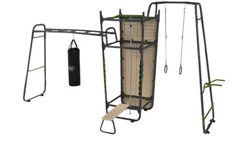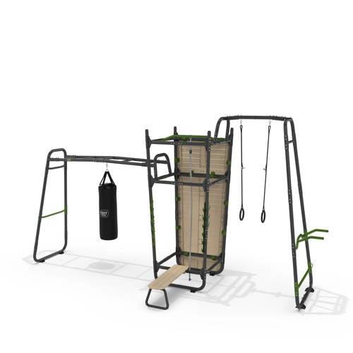De GetSet PS620 wordt geleverd met een uitgebreide set accessoires, waaronder een bokszak, fitnessbank, klimtouw, klimwand, en nog veel meer. Hiermee kun je eindeloos variëren in je workouts en verschillende spiergroepen trainen. Het sporttoestel heeft een stoer en modern design, met een donkergrijs frame en stalen accessoires in een fraaie groentint. Het past daardoor perfect in elke tuin en zorgt voor een sportieve uitstraling.
