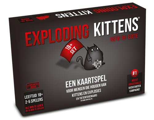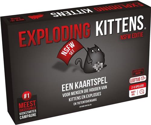 Het kaartspel Exploding Kittens is voor mensen die van katten en explosies houden, maar ook voor tietentovenaars en billenliefhebbers. Dit spel is het meest succesvolle project ooit op Kickstarter! Exploding Kittens is gemaakt door Elan Lee (XBOX), Matthew Inman (The Oatmeal) en Shane Small (XBOX, Marvel) en is een soort Russisch roulette spel. Je neemt een kaart van de stapel tot je een Exploding Kitten-kaart krijgt, op dat moment heb je verloren. Met alle andere kaarten kan je je verdedigen, aanvallen, een beurt overslaan of de katten afleiden! Deze speciale NSFW (Not Safe For Work) 18+ editie van het spel bevat de volledige versie van Exploding Kittens, maar het artwork op elke kaart is vervangen door expliciete inhoud die te aanstootgevend is voor het standaard Exploding Kittens spel. Deze editie kan stand-alone gespeeld worden of kan gecombineerd worden met het originele basisspel voor een spel met maximaal 9 spelers.