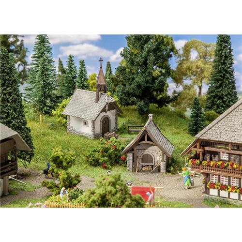 Creëer een prachtige landelijke sfeer op jouw modelspoorbaan met deze gedetailleerde Faller boerderij kapel en bakhuis. De set bestaat uit een gedeeltelijk bepleisterde kapel met een koperen bussen klokkentoren en een bakhuis met een grote oven. Beide modellen zijn minutieus vormgegeven en zorgen voor een authentieke uitstraling op schaal H0.