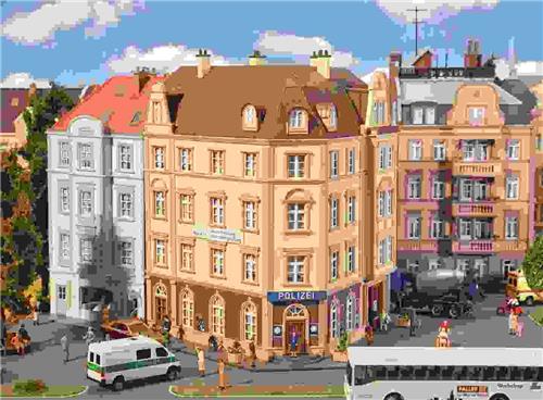 Het politiebureau is uitgerust met een levendige en historische gevel, inclusief massieve raamkozijnen en gedetailleerde afwerking op de bovenverdieping. Dit zorgt voor een authentieke uitstraling die perfect past bij een stadsscène op jouw modelspoor.