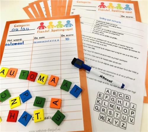 Een leuk en educatief spel waarmee kinderen op een speelse manier hun spellingvaardigheden kunnen oefenen. Het FlexJuf Spelling-Spel is ideaal om op elk moment de gewenste spellingscategorie te oefenen. De set bevat 10 stevig gelamineerde Spelling-spel kaarten en 100 scrabble-letters in verschillende vrolijke kleuren. Daarnaast is er een stevig gelamineerde instructiekaart inbegrepen met een overzicht van de letterwaarden. De kaarten zijn gedrukt op stevig papier en gelamineerd, waardoor ze duurzaam en herbruikbaar zijn. Dankzij het gebruik van whiteboard stiften kunnen de kaarten eenvoudig schoongemaakt worden voor hergebruik voor een andere categorie.