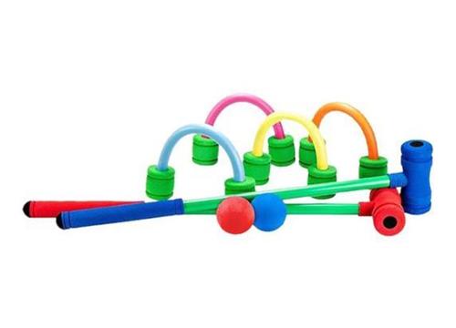 Zet de boogjes uit en probeer de bal er doorheen te slaan. Wie als eerste het circuit afmaakt, wint. Deze croquetset van foam is veilig om mee te spelen en geschikt voor zowel binnen als buiten. Met de kleurrijke sticks en boogjes kunnen kinderen eindeloos plezier beleven.