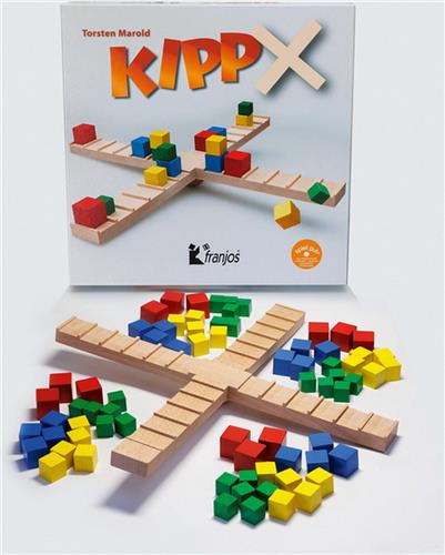 Zal het bord kantelen of niet? Dat is de vraag waarmee spelers elke beurt worden geconfronteerd in KIPP X, een boeiend en uitdagend evenwichtsspel dat toch eenvoudig te spelen is. Plaats gewoon een houten blok op de kruiszaag en dat is het - ware het niet dat het bord kantelt. Om KIPP X te winnen, moet je als eerste al je blokken wegspelen. Om dit te doen, plaats je ze voorzichtig één voor één op een van de opgetilde helften van de afkortzaag. Op een gegeven moment wordt het gewicht echter te groot en kantelt de afkortzaag naar beneden. Als dit gebeurt, moet je alle blokken die eraf vallen meenemen. Je kunt dus niet te stoutmoedig zijn bij het plaatsen van blokken op de opgetilde planken - maar misschien kun je nog één blok plaatsen...