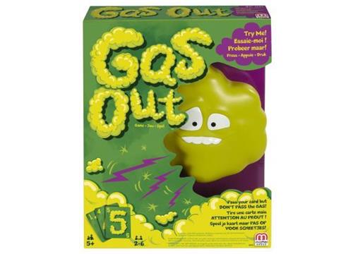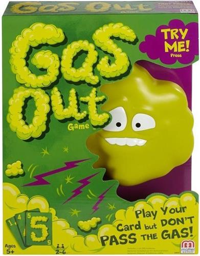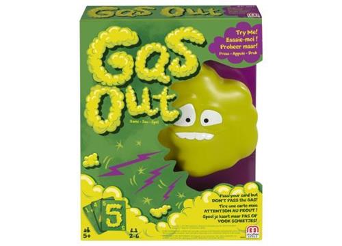 Lachen, gieren, brullen met Gas Out! Het nieuwe kaartspel van Mattel Games dat vieze scheetjes laat! Het is giechelen geblazen met Gas Out! Guster de Gaswolk heeft last van zijn darmen en staat op knappen! Leg Guster in het midden en geef iedere speler 5 Gas Out kaarten. Als je een Cijferkaart speelt, moet je net zo vaak op Guster drukken als het cijfer op de kaart die je speelt - maar pas op! Gusters scheten zijn allesbehalve stil en zeker niet zonder gevolgen! Als Guster een scheet laat, is het spel voor jou afgelopen! Voor extra speelpret bevat het spel een Sla-beurt-over kaart die Guster naar de volgende speler stuurt en een Keer-om kaart die hem terugstuurt. De speler die als laatste stand houdt zonder door scheten te zijn getroffen, is de winnaar! Gas Out wordt geleverd met Guster de elektronische Gaswolk en een spel Gas Out kaarten. Dat wordt urenlang giechelen met het hele gezin! Ideaal voor kinderen vanaf 5 jaar.