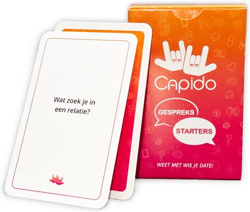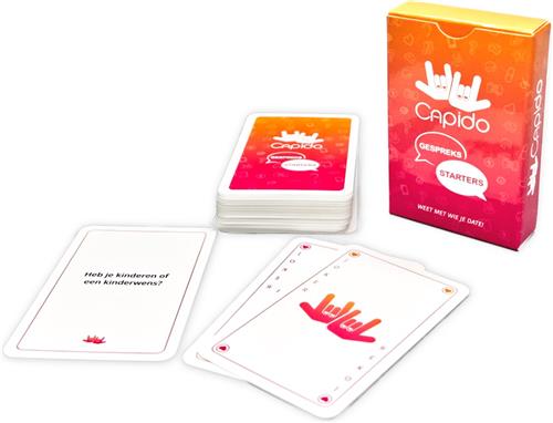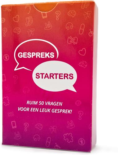 Gespreksstarters is een leuk dating kaartspel met ruim vijftig gesprekskaarten en twee jokers. Het relatie vragenspel bestaat uit vragen die je kan stellen om elkaar beter te leren kennen. Hierdoor heb je altijd een gespreksonderwerp waardoor je een openhartig gesprek met elkaar kunt hebben tijdens een date! Om de beurt pak je een willekeurige gesprekskaart van de stapel en stel je de vraag aan je date. Maak het gesprek nog boeiender door ook jouw eigen antwoord openhartig te delen. Trekt iemand een joker? Dan krijgt deze persoon de kans om zelf een vraag te bedenken of een lastige vraag te ontwijken. Gespreksstarters is niet alleen ideaal voor romantische dates, maar fungeert ook uitstekend als een vermakelijk relatiespel voor vrienden en familie. Het compacte formaat maakt het makkelijk om mee te nemen, waardoor deze kletskaarten de perfecte toevoeging zijn voor elke sociale gelegenheid. Enkele voorbeeldvragen zijn: - Waar let je op als je iemand voor het eerst ontmoet? - Waaraan besteed jij het liefst je vrije tijd? - Hoe ziet jouw ideale partner eruit?