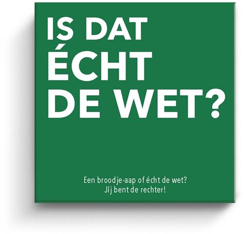'Is dat echt de wet?' bevat 200 kaarten met verschillende wetten en spelregels. Het doel van het spel is om te raden of de vreemde wet die wordt voorgelezen echt bestaat of compleet verzonnen is. Degene die als eerste het juiste antwoord geeft, wint de kaart. Verzamel vijf kaarten en word gekroond tot de winnaar van het spel!
