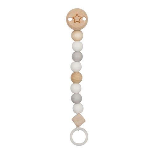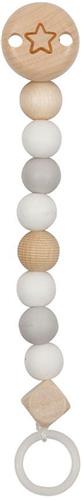 Dit speenkoord van Goki is een handig accessoire voor baby's. Het dient niet alleen als bijtring, maar ook als speenkoord. Je kunt de speen eenvoudig aan het koord bevestigen en de handige klip maakt het mogelijk om het koord vast te maken aan kleding of een dekentje, zodat de speen niet kwijtraakt. De fopspeenketting is gemaakt van hoogwaardig afgewerkt hout en heeft vrolijke kralen in verschillende kleuren, waaronder wit en grijs. Daarnaast prijkt er een schattige ster op de houten klip, wat het geheel een speels karakter geeft.