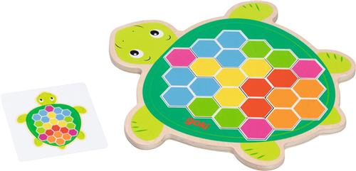 De schildpad beschikt over een ongewoon kleurig schild en is vervaardigd uit hoogwaardige materialen zoals duurzaam hout en karton. Dit maakt de puzzel niet alleen aantrekkelijk om mee te spelen, maar ook veilig voor de jonge gebruikers. Met de afmetingen van 23,5 x 22,5 cm is het de perfecte grootte voor kleine handen.