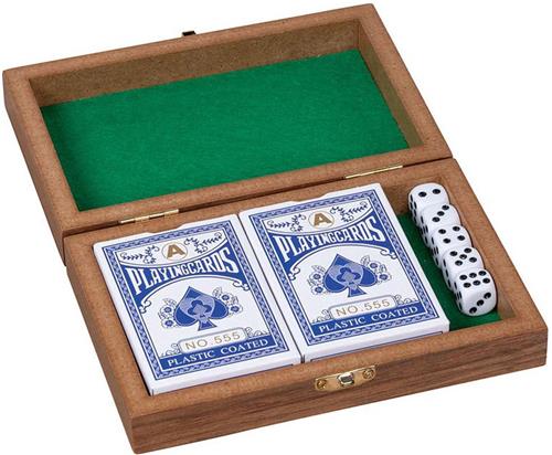 Laagste prijs € 13,99 voor Goki Houten Speelkaartenbox met 5 Dobbelstenen en 2 Sets kaarten is gemeten op 11-01-2025.