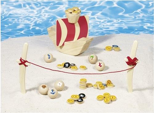 De spelers moeten een piratenschat van massief hout vinden. Maar let op: de kapitein van de piraten waakt over de schat. Door middel van de houten ballen moet je de goudenmunten van de mast gooien. Voor 2 - 6 spelers. Afmeting 24 x 18 x 21 cm.