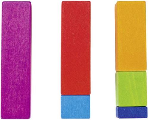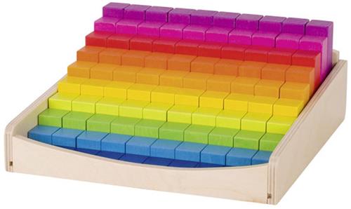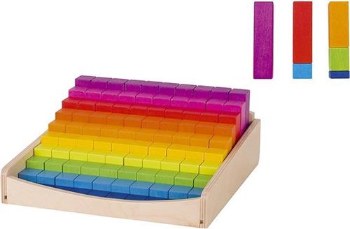 Klassiek hulpmiddel voor het leren van de tafels van 1 tot 10. Deze staafjes hebben al vele generaties geholpen bij het visueel krijgen van rekensommen. Deze set bestaat uit 100 houten blokjes in 10 verschillende kleuren in een mooie houten opbergbak. Inclusief instructies.