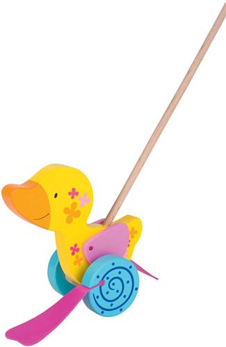 Laat je kleintje vrolijk rondhobbelen met de Goki Susibelle Duwfiguur Eend! Met een stevige houten stang duw je de bontgekleurde eend voor je uit en zie je hoe zijn flippers draaien en stappen zetten. De eend is gemaakt van duurzaam hout en heeft beweegbare vleugeltjes, wat zorgt voor uren speelplezier. Waar gaan jullie samen naartoe op jullie avontuurlijke reis?