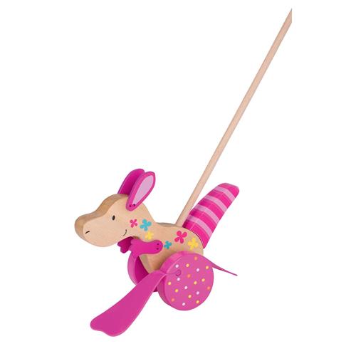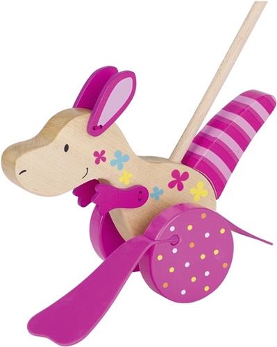 Laat je betoveren door de vrolijke Goki Susibelle Duwfiguur Kangoeroe! Met een stevige houten stang duw je deze schattige roze kangoeroe voor je uit en zie je hoe de flippers draaien en stappen maken. Het prachtig gedetailleerde diertje is gemaakt van duurzaam hout en heeft beweegbare handen, oortjes en een draaibare staart. Gegarandeerd uren speelplezier voor jongens en meisjes vanaf 12 maanden!