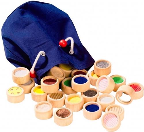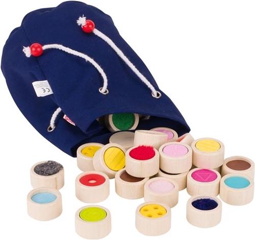 Met de Goki Tast Memory in Tas kunnen kinderen vanaf 4 jaar genieten van een educatief spel voor 2 tot 4 spelers. In de katoenen tas met sluitkoord zitten 32 houten voel-blokjes en een handleiding. Het spel neemt ongeveer 30 minuten in beslag en is volledig in het Nederlands. Kinderen kunnen hun tastzin gebruiken om te raden welk materiaal ze voelen, zoals vilt, schuurpapier, karton en meer. Ze kunnen vervolgens proberen het bijpassende blokje te vinden door de oppervlaktes te voelen. Zo stimuleert dit spel de motorische vaardigheden en het denkvermogen van kinderen.
