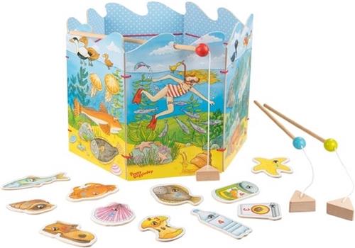 Het Goki visspel uit de Peggy Diggledey-milieuserie combineert het grenzeloze plezier van vissen met het probleem van het behoud van de zee. Op een speelse manier communiceert het spel alles wat niet in de zee thuishoort, zonder een moraliserende vinger te bewegen. De prachtige illustraties stimuleren de kinderen ook om te blijven vissen. Het spel bestaat uit 1 visvijver en 15 stukjes, allemaal kleurrijk en gemaakt van hout. Met een diameter van 30 cm biedt de vijver voldoende ruimte voor kinderen om te vissen en te leren. Het Goki visspel is geschikt voor kinderen vanaf 3 jaar en een geweldige manier om spelenderwijs te leren over het milieu.