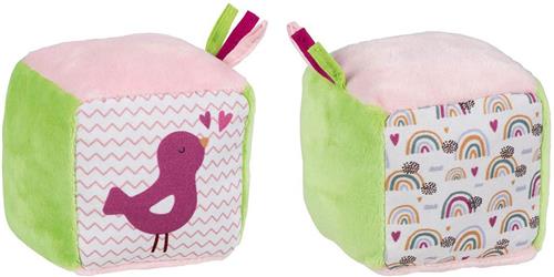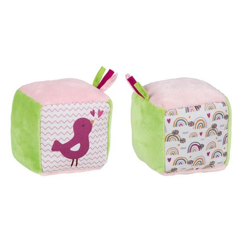 Laat je kleintje genieten van deze zachte kubus van Goki. De roze en groene stoffen kubus is voorzien van knisperfolie en een belletje, waardoor er verschillende speelelementen zijn om te ontdekken. Aan de ene kant van de kubus is een schattig vogeltje afgebeeld, terwijl aan de andere kant vrolijke regenbogen te zien zijn. Dit educatieve spel is perfect voor baby's en stimuleert de zintuigen en de hand-oog coördinatie van je kleintje.