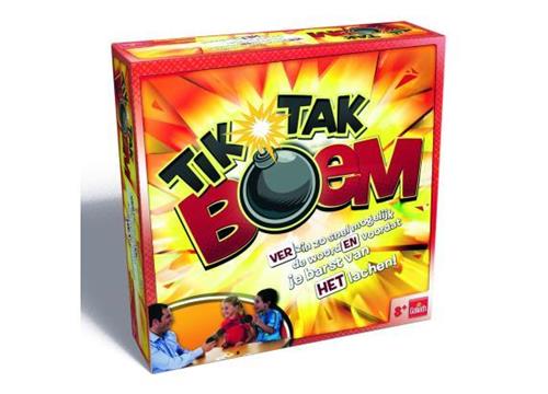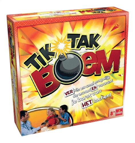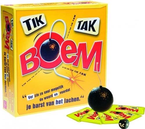 Het spel Tik Tak Boem is een zenuwslopend woordspel. Verzin zoveel mogelijk woorden voordat de bom afgaat. Gaat de bom bij jou af, dan ontvang je één strafpunt. Het spel Tik Tak Boem is een zenuwslopend woordspel waarbij je zo snel mogelijk woorden moet vinden met een opgelegde lettergreep. Probeer de bom door te geven voordat deze in jouw handen ontploft. Het spel is geschikt voor kinderen vanaf 8 jaar en kan gespeeld worden door 2-12 spelers.