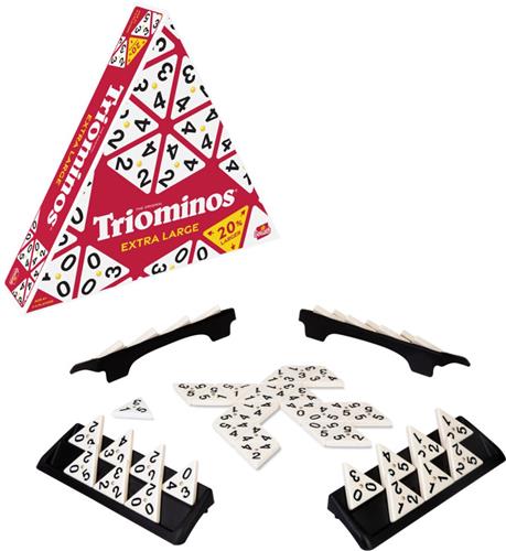 Triominos XL is ontwikkeld voor mensen die iets meer moeite hebben met de normale stenen. Deze stenen zijn voorzien van grotere cijfers, waardoor ze makkelijker te lezen zijn. Een mooie versie van dit tactische spel! Het spel begint door een willekeurige steen op tafel te leggen en de speler scoort ook de waarde van deze steen. Iedere speler probeert tijdens zijn beurt een van zijn Triominos stenen passend aan te leggen. De stenen mogen passend aangelegd worden aan alle kanten van alle stenen die reeds op tafel liggen. Het spel eindigt wanneer een speler al zijn stenen van zijn plankje heeft gespeeld. Door het leggen van bepaalde figuren kan men extra punten verdienen. De winnaar is uiteindelijk degene met de meeste punten.
