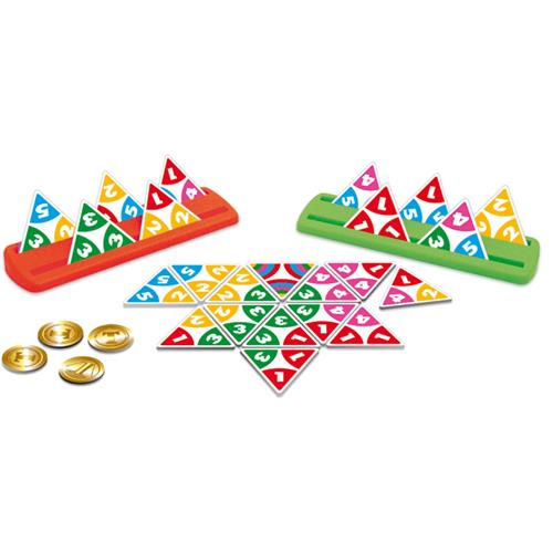 Met Triominos Junior leer je met behulp van kleuren spelenderwijs spelen! Met het originele ontwerp en de nieuwe extra sterke tegels ontwikkelen je kinderen hun motoriek, leren ze de kleuren te herkennen en hebben ze tegelijkertijd veel plezier! Triominos is er nu voor de allerkleinsten! In 2 spelniveua's leren kinderen de basisprincipes van het bekende Triominos. Spelomschrijving Triominos Junior. In het eerste spelniveau, geschikt vanaf 5 jaar, is het de bedoeling om zo veel mogelijk beloningsfiches te verdienen dood de juiste Triominos naast elkaar te leggen. Om te beginnen wordt er een Triominos van de pot genomen en open op tafel gelegd. Vervolgens moeten de spelers ombeurten een steen aan leggen door allee cijfers en kleuren aan elkaar te laten grenzen. Als je succesvol een Triominos aanlegt krijg je een beloningsfiche. Als je geen Triominos van je rekje kunt of wilt aanleggen mag je er eentje uit de pot pakken om op je rekje te zetten. Dit kost je wel een beloningsfiche. Als een speler alle steentjes kwijt is worden de fiches geteld, de persoon met de meeste fiches is de winnaar. Spelers kunnen er ook voor kiezen om met de joker te spelen. De joker is de enige Triominos die je van tafel mag pakken en weer op je rekje mag zetten. Wie hem oppakt, moet hem op tafel vervangen door een eigen Triominos die past op de plaatst waar de joker lag. In het 2e spelniveau wordt er gespeeld zonder beloningsfiches. In plaats daarvan wordt er in dit niveau gewerkt met punten. Als je een steen aanlegt scoor je de som van de 3 getallen op je aangelegde steen. De speler die de meeste punten heeft op het moment dat iemand zijn plankje leeg heeft is de winnaar! Er zijn ook andere versies van Triominos, waaronder de Originele, XXL en Travel versie. Deze versies bieden allemaal een andere twist op dit tactische en leuke spel. Colors is speciaal voor kids ontworpen, XXL voor de wat slechter zienden onder ons en Travel is heel handig voor als je op reis gaat en dit spel niet wil missen. Inhoud: - 36 papieren triominos-stenen - 4 plastic plankjes - 60 munten - Spelregels