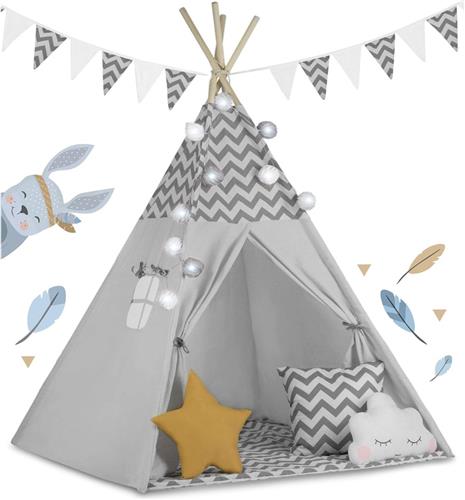 De speeltent is ontworpen met het oog op zowel kinderen als ouders. Het moderne grijs past perfect bij verschillende interieurstijlen en de hoogwaardige materialen zorgen voor duurzaamheid en veiligheid tijdens het spel. De ademende katoenen stof (175 g/m²) is niet alleen zacht, maar ook bestand tegen intensief gebruik. Bovendien blijft de tent stevig staan dankzij de massieve dennenhouten palen, waardoor hij ideaal is voor elk speels avontuur.