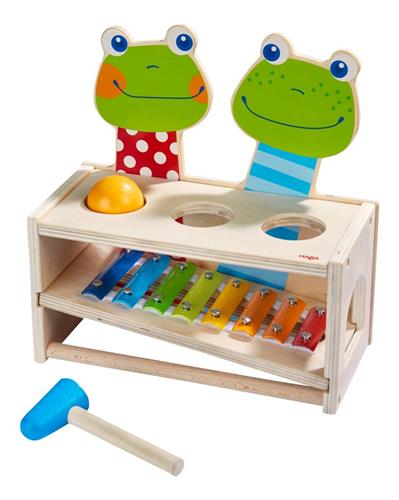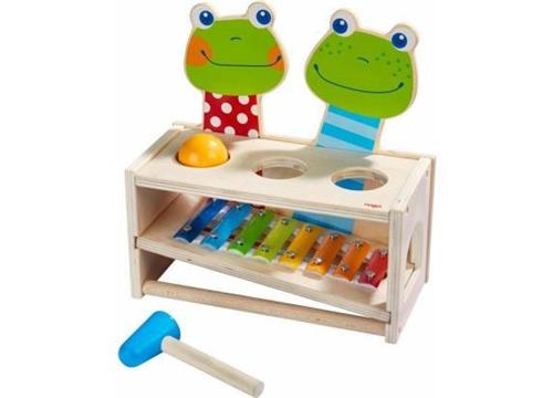 Met de Haba Muziekhamerbank Kikkerconcert kunnen kinderen zich urenlang vermaken door de bal behendig door de gaten te kloppen of melodieën te creëren met de metallofoon. Deze veelzijdige set ondersteunt op speelse wijze de muzikale ontwikkeling van kinderen, versterkt het ritmegevoel en bevordert de fijne motoriek. Of ze nu de hamerbank gebruiken of de metallofoon bespelen, plezier hebben ze sowieso!