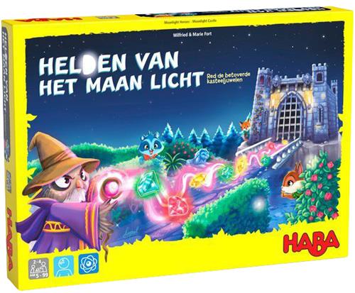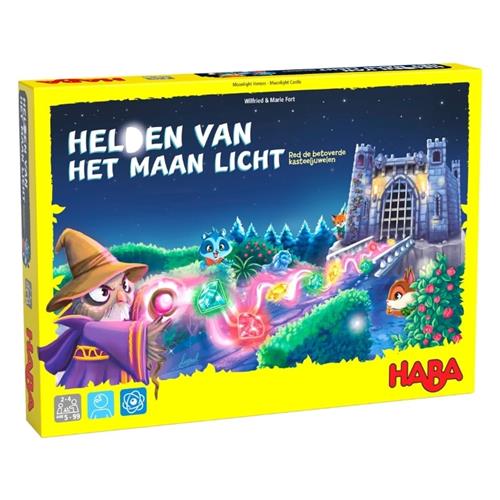 Helden van het maanlicht van HABA is een spannend bordspel waarin spelers de taak hebben om tovenaar Zirroz te stoppen. In het maanlicht laat hij alle edelstenen zweven en het is aan de spelers om deze te verzamelen en te ruilen voor gestolen schatten. Maar pas op, de kleuren moeten wel passen! Het spel bevat een fascinerend schuifmechanisme dat altijd nieuwe edelstenen in het spel brengt en een leuk 3D-kasteel voor een betoverende sfeer.