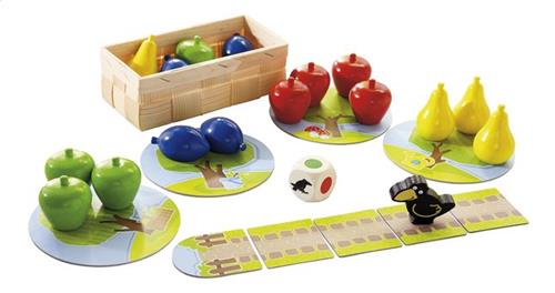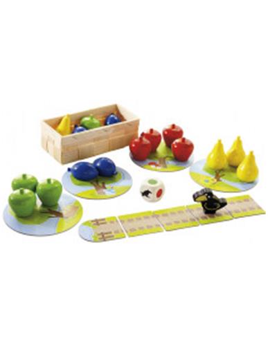 Met een aanbevolen leeftijd vanaf 2 jaar is dit spel geschikt voor 1 tot 4 spelers en heeft een speelduur van ongeveer 10 tot 15 minuten. De inhoud van de doos bevat een raaf, een fruitmand, groene appels, rode appels, gele peren, blauwe pruimen, parcourskaartjes, bomen, een dobbelsteen met kleuren en symbolen, en spelregels.