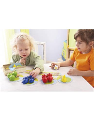 Haba Mijn Eerste Spellen - Eerste Boomgaard is een dobbelsteenspel dat behoort tot de reeks 'Mijn eerste spellen' van het Duitse merk Haba. De spelklassieker Boomgaard is speciaal aangepast voor de allerkleinsten, met regels die passen bij hun leeftijd en spelmateriaal dat perfect is afgestemd op kleine kinderhanden. De houten stukken nodigen uit tot vrij spelen en stimuleren de motorische vaardigheden van de kinderen.