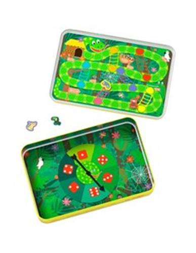 Haba Reisspel Jungle Ladderspel is perfect voor onderweg in de auto of vliegtuig. Het spel zit verpakt in een metalen doos met magneten, wat ideaal is voor op reis. Thuis kan dit spel ook gespeeld worden voor eindeloos plezier. In plaats van een dobbelsteen te werpen, draait de pijl om aan te geven hoeveel stappen je vooruit mag. Het doel is om als eerste bij de hut te zijn, maar onderweg kom je obstakels tegen die je rit kunnen bevorderen of vertragen.