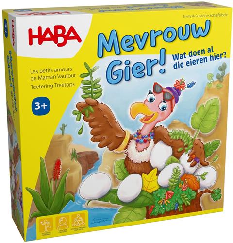 Dit educatieve spel van Haba, genaamd "Mevrouw Gier! Wat doen al die eieren hier?", is geschikt voor kinderen vanaf 3 jaar. Het spel is zowel in het Frans als in het Nederlands verkrijgbaar, zodat kinderen op een leuke en leerzame manier met beide talen in aanraking komen. Het materiaal van het spel bestaat uit karton en hout, waardoor het duurzaam en van hoge kwaliteit is.