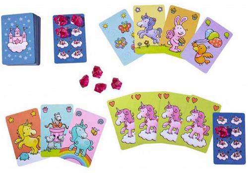Maak kennis met het Haba spel Eenhoorn Flonkerglans Flonkerbingo, een magisch spel dat kinderen uitnodigt om op een speelse manier hun concentratie en geheugen te verbeteren! Dit vrolijke spel brengt spelers samen rond een leuke flonkerbingo, waarbij ze afbeeldingen op omgedraaide kaartjes moeten zoeken op hun eigen bingokaart. Wie als eerste vier wolkenkristallen op een rij heeft, wint het spel!