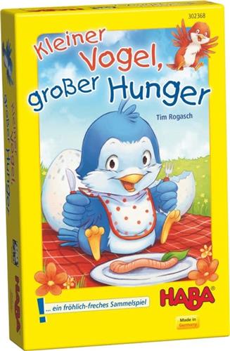 Kijk eens aan, wie kruipt daar uit het ei? Vier ondeugende kuikentjes worstelen zich uit hun eierschaal en hebben al meteen een reuzenhonger. Er is maar één oplossing: voedsel zoeken. Opgelet: geluk met de dobbelsteen beslist waarmee de kuikens gevoerd mogen worden en hoe snel ze groeien. Wiens kuiken wordt als eerste een sierlijk vogeltje? Kleine Vogel, Grote Honger is een kinderspel van Haba.