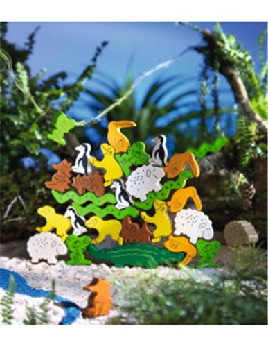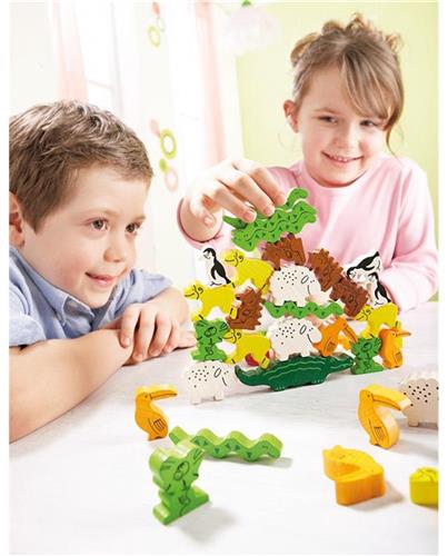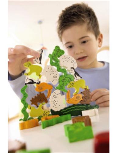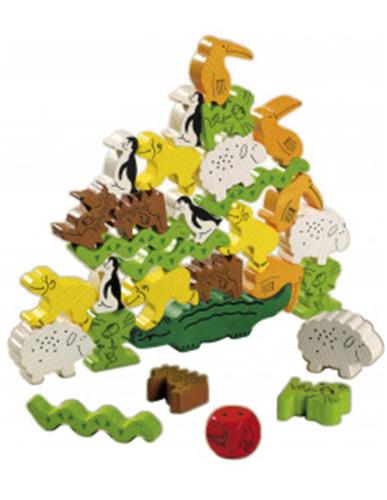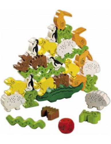 De set bevat 29 houten dieren, 1 speciale dobbelsteen en een handleiding. Met de houten dieren kunnen kinderen hun fijne motoriek en hand-oog coördinatie ontwikkelen, terwijl ze tegelijkertijd plezier hebben met het bouwen van de piramide.