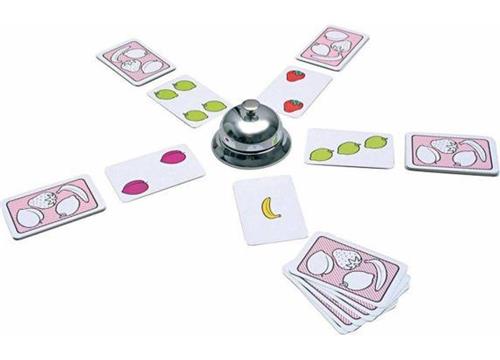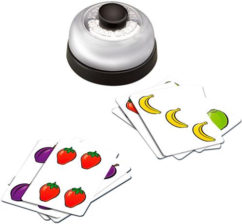**Het hilarische en snelle reactie spel met de bel! Leuk voor jong en oud. Aan een grote vruchtensalade met bananen, aardbeien, citroenen en pruimen worden door de spelers alsmaar vruchten toegevoegd. Maar let goed op: als er precies 5 dezelfde vruchten bovenop liggen, dan moet je snel op de bel slaan en de vruchtendsalade serveren!** Speeltijd: ca. 15 minuten.