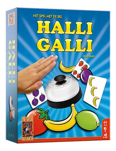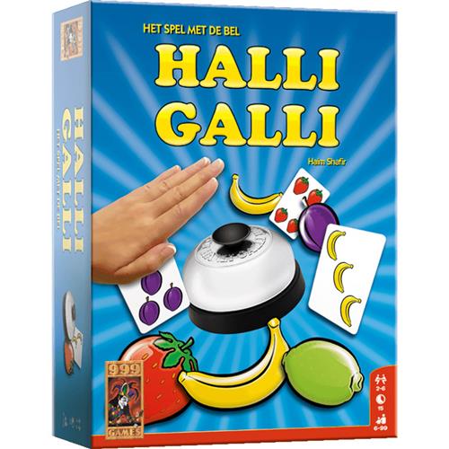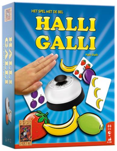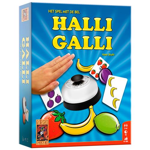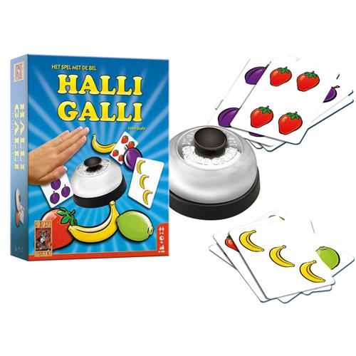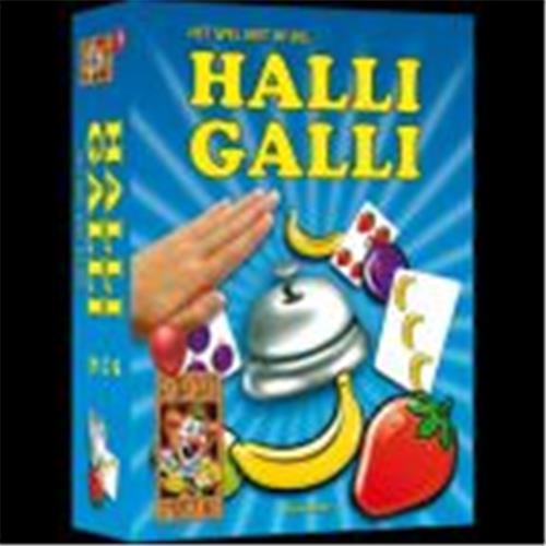Spectaculair reactiespel. Wie tot 5 kan tellen, kan meedoen Iedere speler krijgt een gedekte stapel kaarten. Op elke kaart staan één of meer vruchten. Om beurten draait iedere speler een kaart om en legt deze op zijn eventueel eerder omgedraaide kaarten. Zo is voor iedere speler altijd maar één kaart zichtbaar. Als van een bepaalde vrucht precies 5 exemplaren zichtbaar zijn, proberen alle spelers zo snel mogelijk op de bel te drukken. Wie dat als eerste doet, krijgt alle open kaarten. Wie geen kaarten meer heeft, is uitgeschakeld. Wie blijft als laatste over? Halli Galli is niet alleen leerzaam voor jonge kinderen, maar ook uitstekend vermaak voor studenten of families die gewoon even een eenvoudig, gezellig spelletje tussendoor willen spelen.