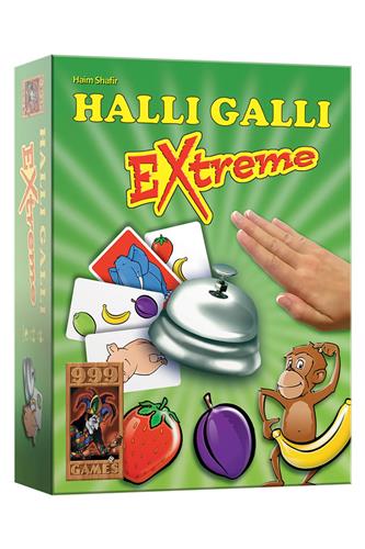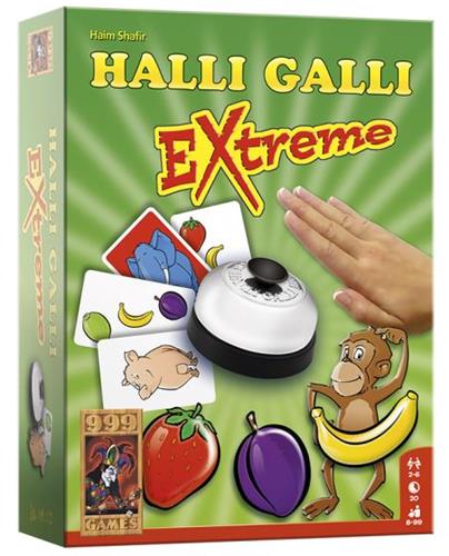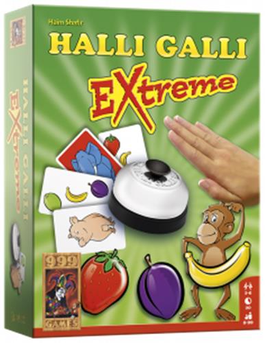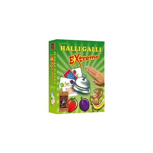 Spectaculair vervolg op het populaire spel met de bel. Iedere speler krijgt een gedekte stapel kaarten. Op elke kaart staan één of meer vruchten of een dier. Om beurten draait iedere speler een kaart om en legt deze op zijn eventueel eerder omgedraaide kaarten. Zo is voor iedere speler altijd maar één kaart zichtbaar. De spelers proberen op de bel te drukken als: - er twee gelijke vruchtenkaarten zichtbaar zijn - er een olifant zichtbaar is, maar geen aardbeien - er een aap zichtbaar is, maar geen citroenen - er een varken zichtbaar is. Wie dat als eerste doet, krijgt alle open kaarten. Wie geen kaarten meer heeft, is uitgeschakeld. Wie blijft als laatste over? Halli Galli Extreme maakt het bekende spel met de bel nog chaotischer en hilarischer. Wanneer moet je bellen en wanneer juist niet? Opletten geblazen dus!