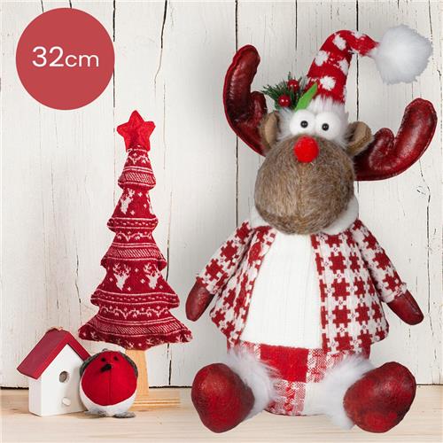 Handgemaakt zittend rendier-mannetje 32/40 cm geblokte kerstbroek
