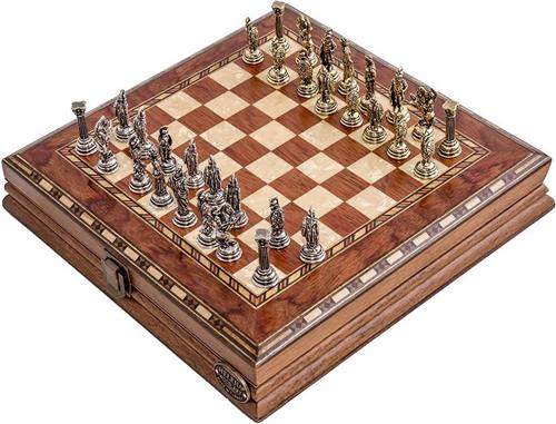 Deze schaakset van Helena Wood Art is handgemaakt met aandacht voor detail en wordt geleverd met stijlvolle metalen schaakstukken. Met specificaties zoals een speeltijd van 60 minuten en aanbevolen minimum leeftijd van 6 jaar, is dit schaakspel geschikt voor zowel kinderen als volwassenen die van bordspellen houden.