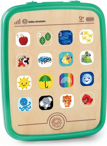 Met de Hape Magic Touch-activiteitentablet kunnen baby's, dreumesen en peuters op ontdekkingsreis gaan. Door een lichte aanraking van één van de 16 apps op de houten tablet begint de pret en wordt één van de 150 melodieën geactiveerd! De kleuren, getallen, dieren en voorwerpen worden in het Engels, Frans en Spaans genoemd. De fijne motoriek en zintuigen worden gestimuleerd door het spelen met deze houten speelgoedtablet. Met deze duurzame houten innovatieve houten tablet zijn er geen zorgen om een gebroken scherm.