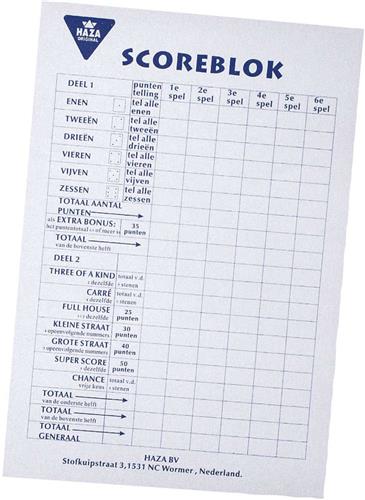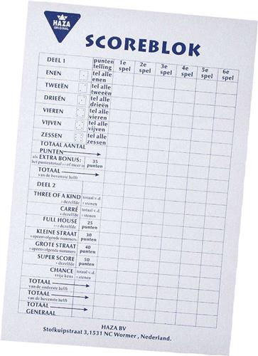 - De goedkoopste webshop om Haza Original Scoreblok Yahtzee 50 Vel te kopen is voor het laatst gecontroleerd op vrijdag 5 december 2025.