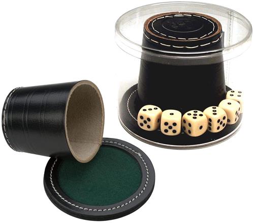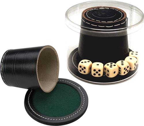 De HOT Games Pokerbeker is een must-have voor elke pokerspeler. De beker wordt geleverd met een deksel en 6 grote dobbelstenen, waardoor het perfect is voor verschillende dobbelspellen. De beker en deksel zijn gemaakt van hoogwaardig leer, waardoor ze duurzaam en stijlvol zijn. De diameter van de deksel is 12 cm, de bovenkant van de beker is 9 cm, de onderkant is 7 cm en de hoogte van de beker is 8,5 cm. De kleur van zowel de beker als de deksel is elegant zwart. De dobbelstenen hebben een afmeting van 18 x 18 x 18 mm en zijn crèmekleurig.