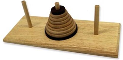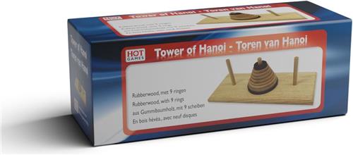 De Hot Games Toren van Hanoi met 9 schijven is een combinatiespel geïnspireerd op een legendarisch Boeddhistisch probleem. Volgens de legende moesten 100 albasten schijven van de ene naar de andere zilveren pilaar worden verplaatst, waarbij de wereld zou eindigen als de laatste schijf correct werd neergelegd. Dit spel daagt spelers uit om de negen houten schijven van positie B naar posities A en C te verplaatsen, waarbij elke schijf een kleinere diameter heeft dan de vorige.